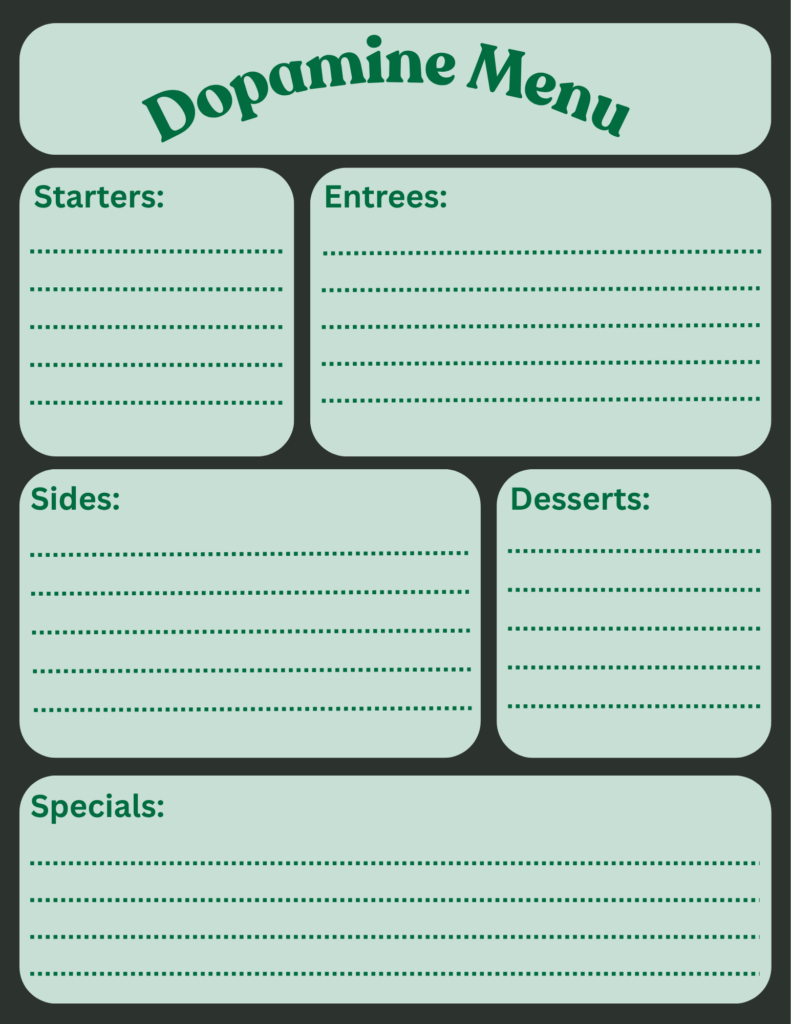 A dopamine menu is a set of personalized activities that help spark motivation in your brain during periods of procrastination, feeling unmotivated or being overwhelmed. This tool is intended to provide options in a similar manner to how one would pick out dishes from a restaurant menu: it includes starters, entrees, sides, desserts and specials.